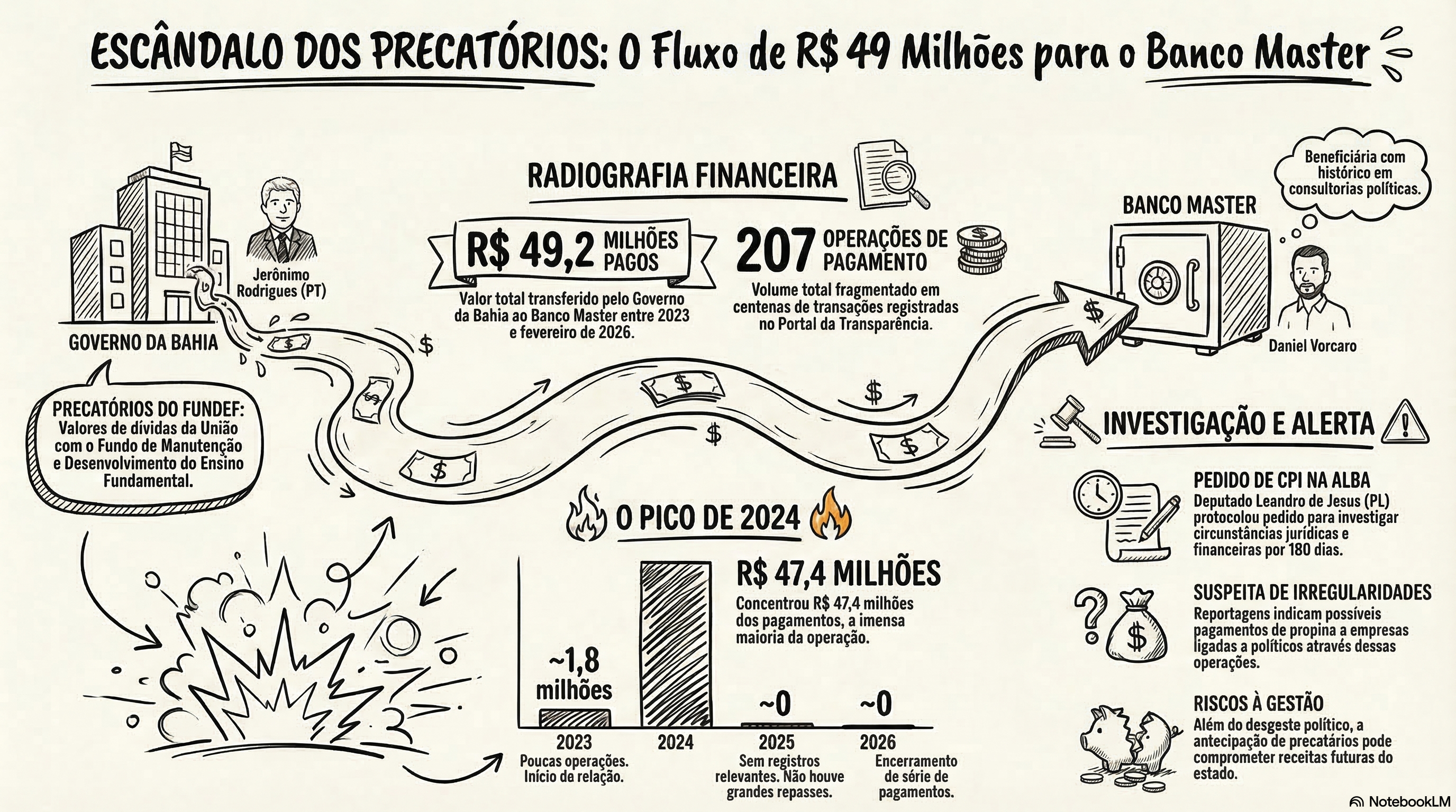 Entre 2023 e 2026, o governo da Bahia realizou 207 pagamentos de precatórios ao Banco Master, totalizando R$ 49,2 milhões, com destaque para 2024, quando foram desembolsados R$ 47,4 milhões. Os valores se referem a antecipações de créditos do Fundef e constam no Portal da Transparência. A concentração das operações levantou questionamentos na Assembleia Legislativa, onde já foi protocolado pedido de CPI para investigar possíveis irregularidades. O caso envolve o governador Jerônimo Rodrigues e pode gerar repercussões políticas e jurídicas nos próximos meses.